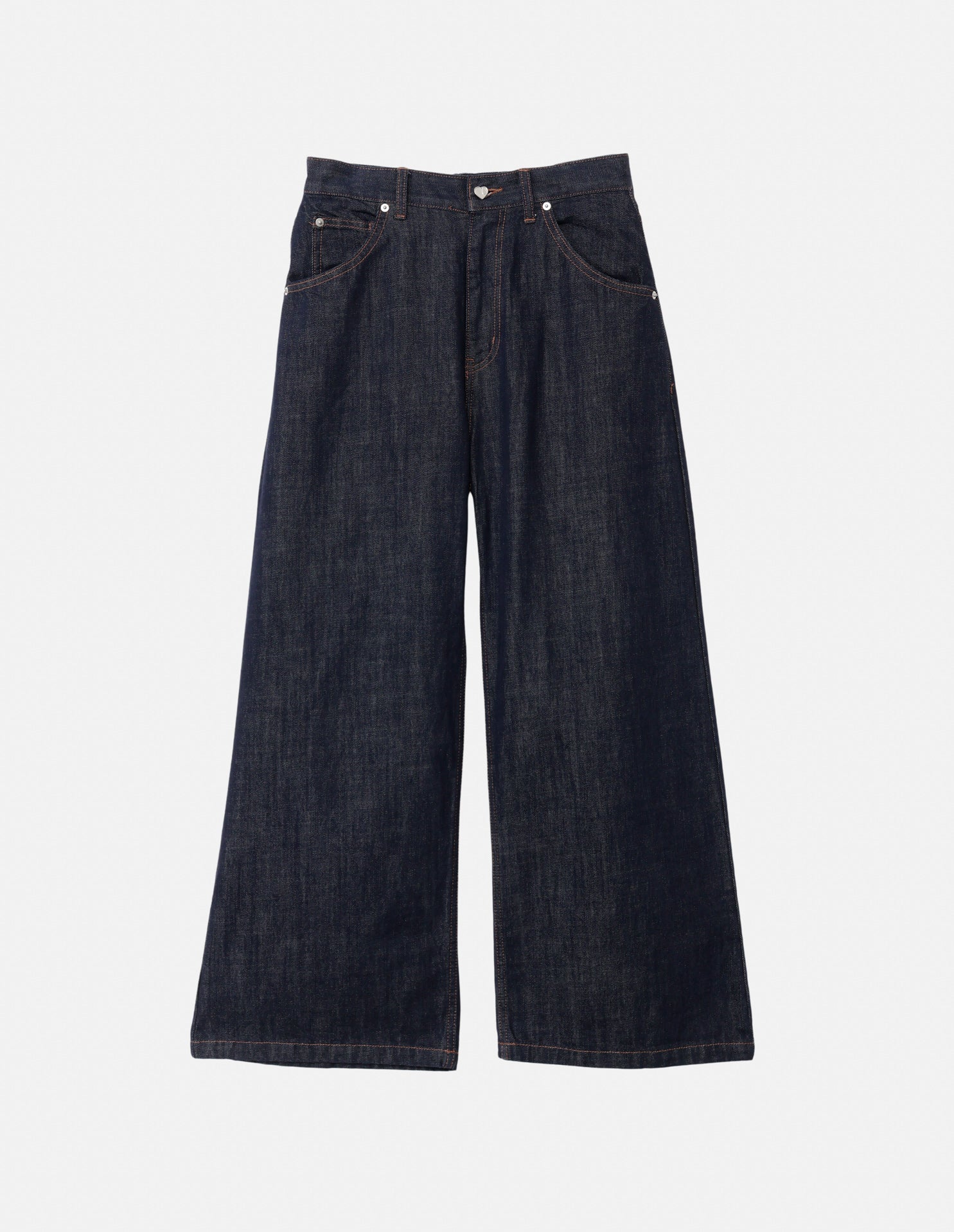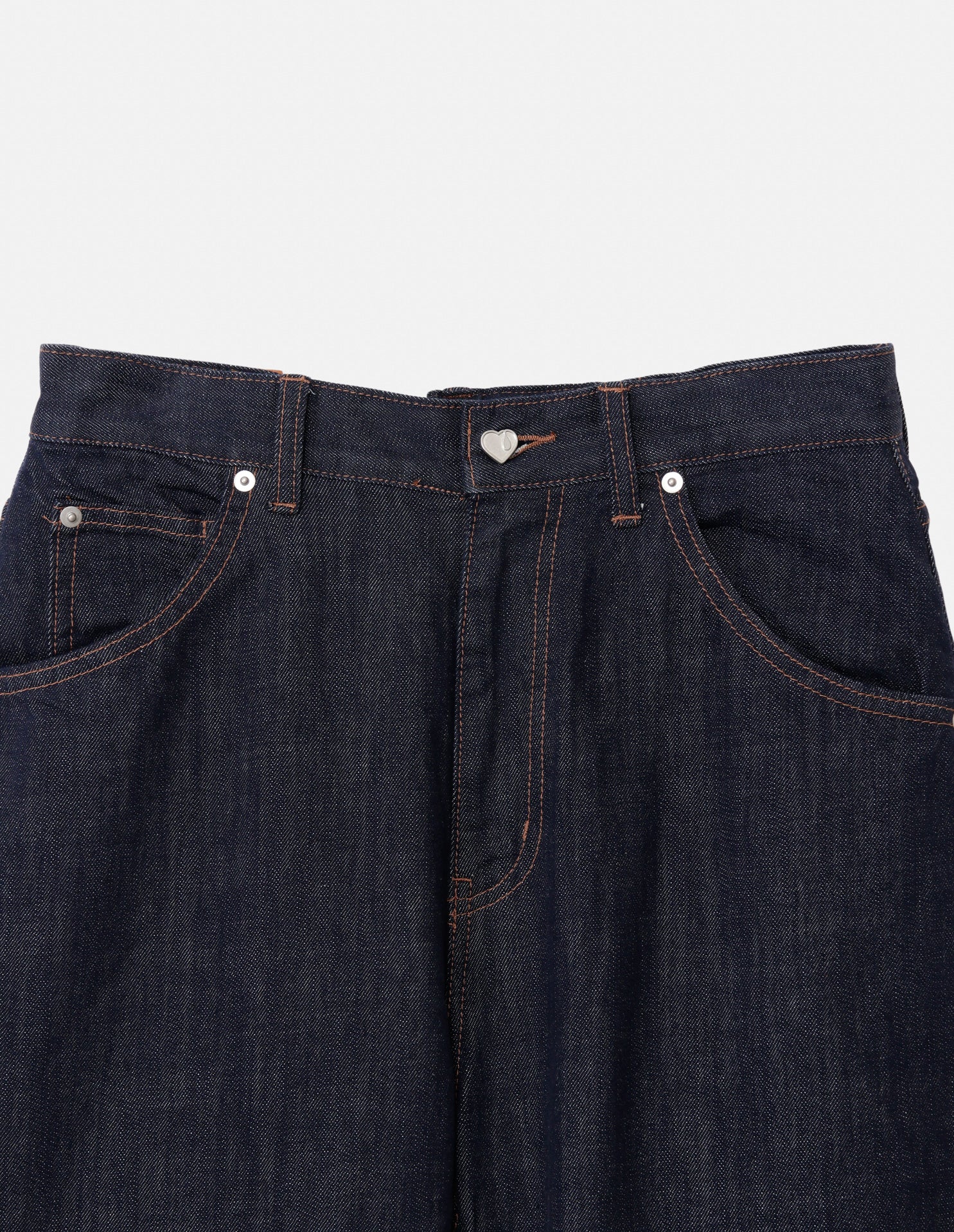 ウエストのドロップハート型のオリジナルボタンとバックポケットのハート型ステッチがポップで目を惹くデニムパンツ。