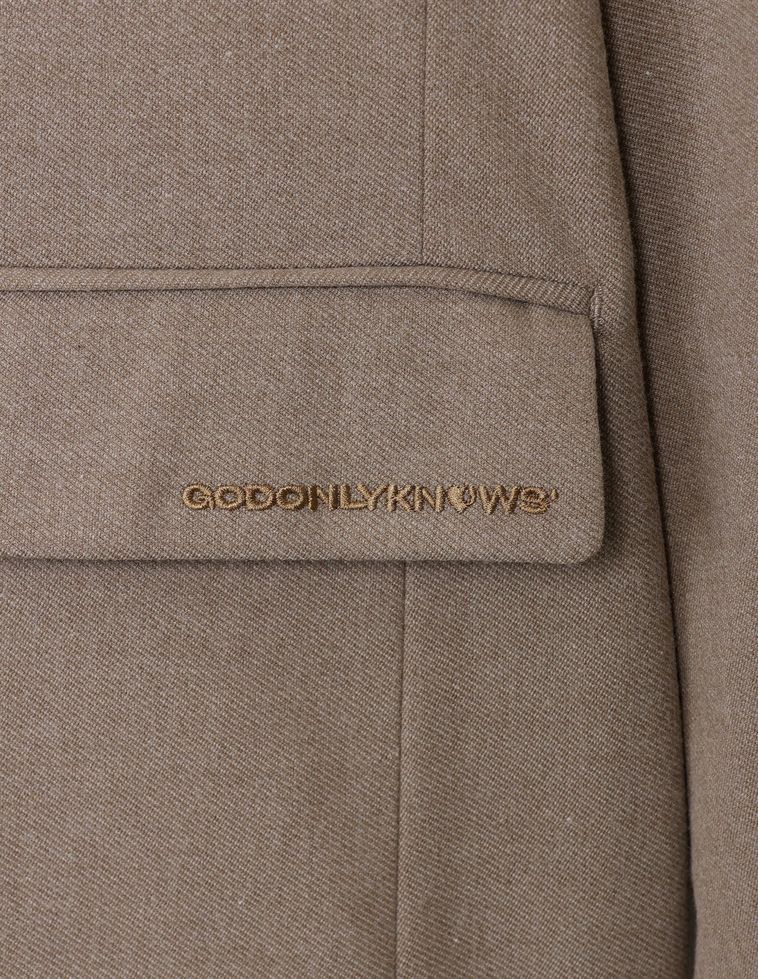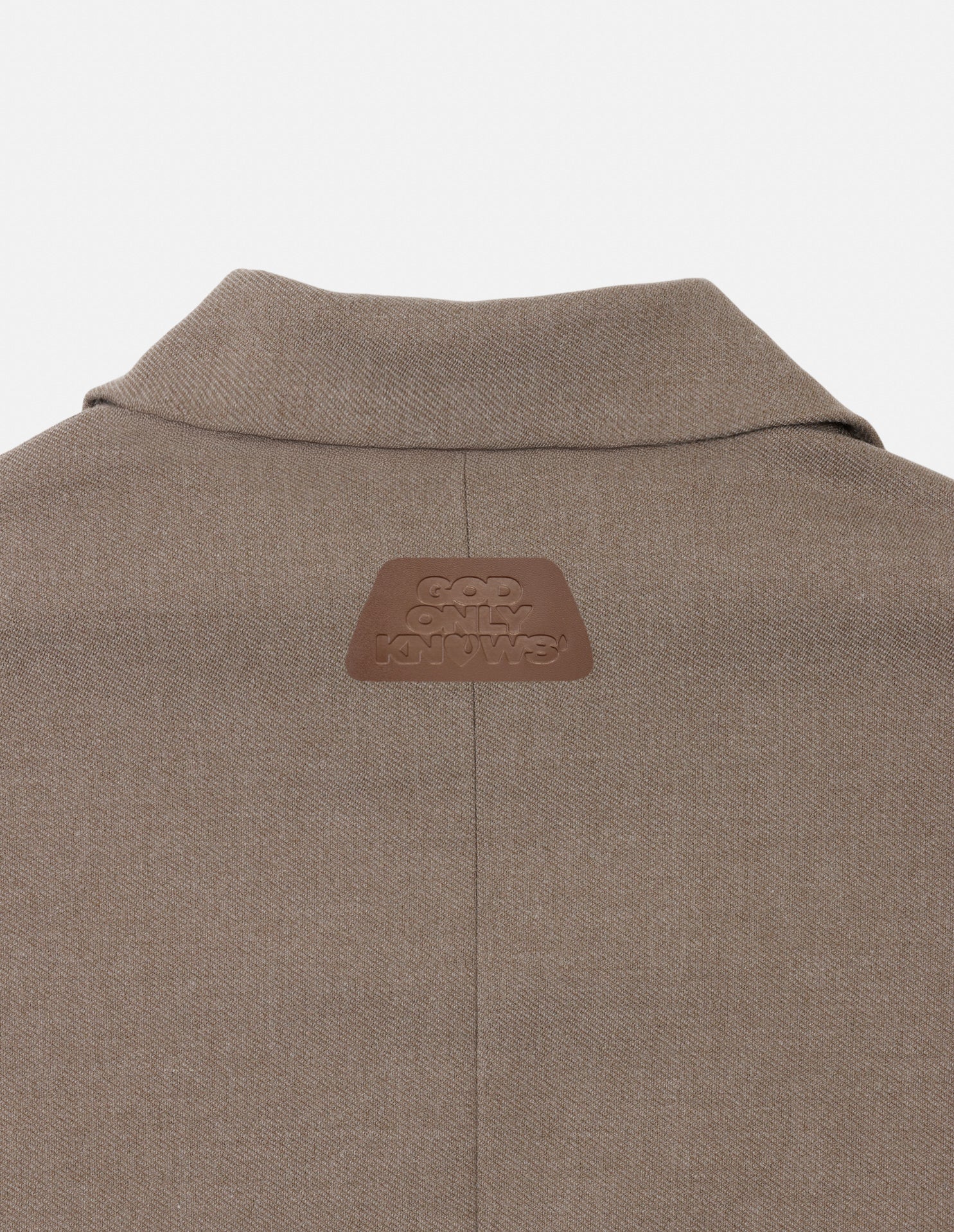 背面にはGOD ONLY KNOWSのレザーパッチを配置し裏地やボタンにもロゴ入りのブランドオリジナルを採用。